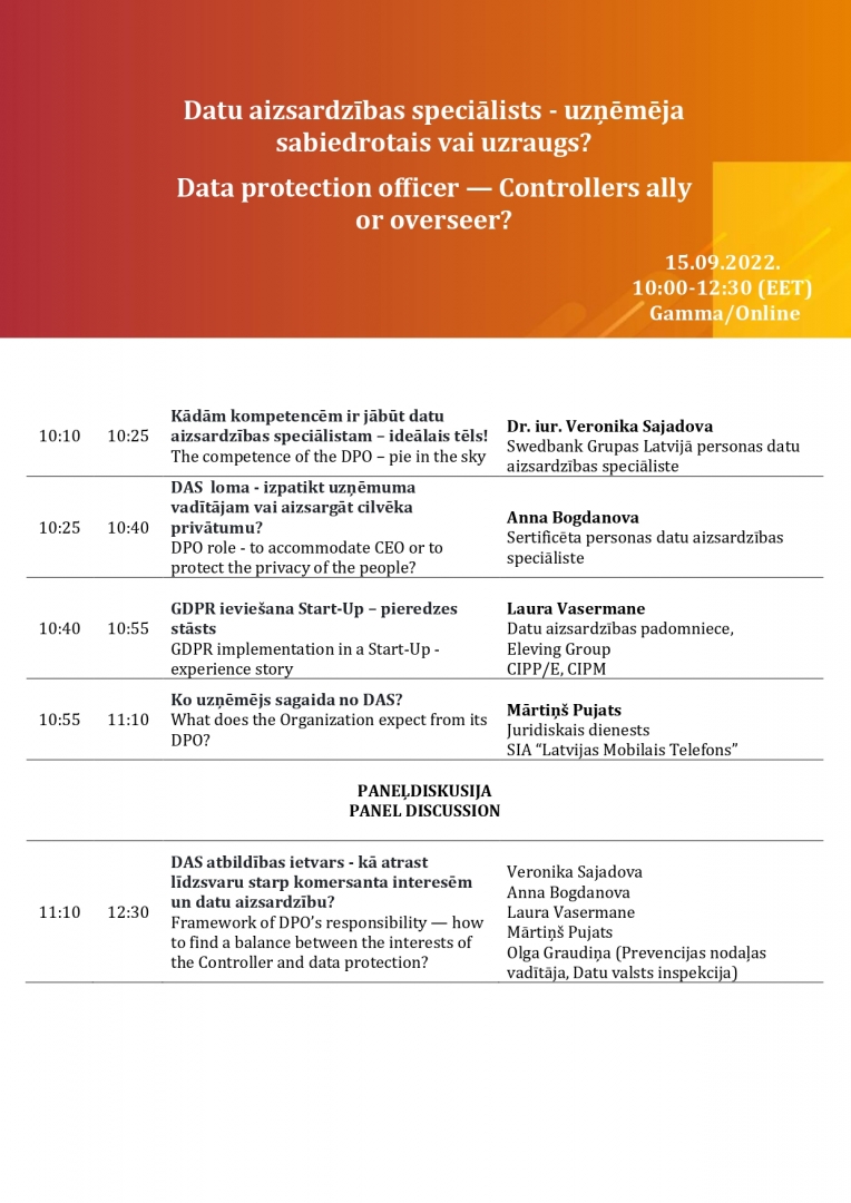 (LV) Sesijas laikā dalībnieki diskutēs par datu aizsardzības speciālista atbildības ietvaru, lai rastu atbildi uz jautājumu - kā atrast līdzsvaru starp komersanta interesēm un datu aizsardzību?