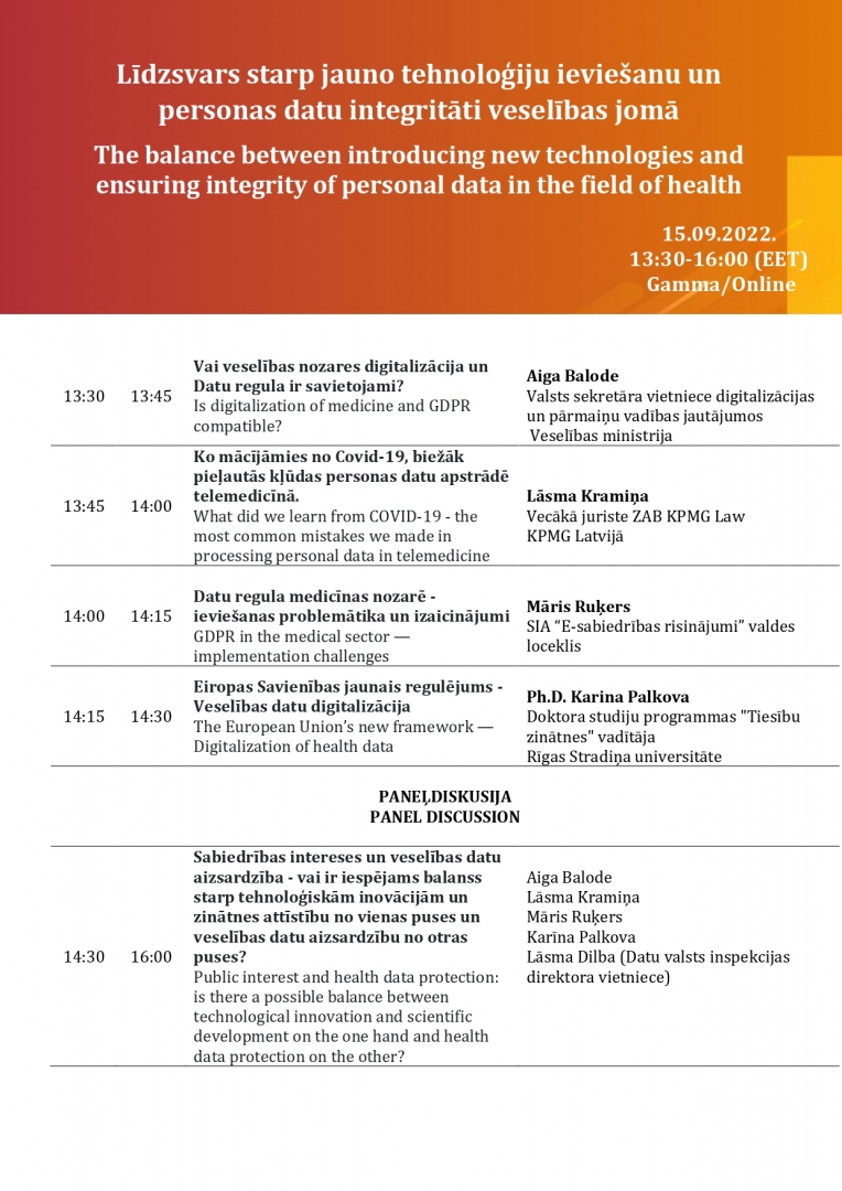 (LV) Sesijas laikā dalībnieki diskutēs par tehnoloģiju inovācijām un zinātnes attīstības mijiedarbību ar veselības datu aizsardzību. Veselības datu digitalizācija.